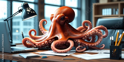 Octopus multitasking in a modern office environment, symbolizing productivity, creativity, and the humorous challenges of multitasking in a corporate workspace setting