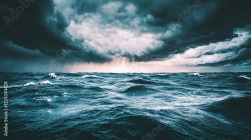 Of a Dramatic storm clouds over a vast open ocean with rays of light breaking through the darkness