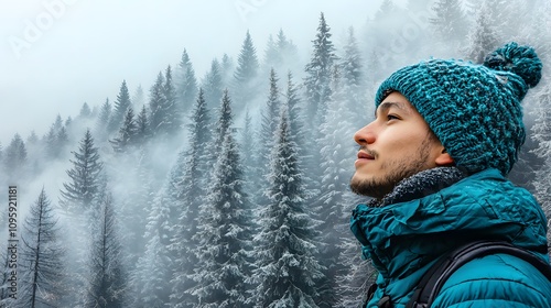 of a man with an overlay of foggy pine trees, creating a serene and introspective scene.Double Exposure.[men]:[Fog in nature]