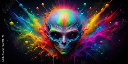 of an alien head with vibrant, multicolored splashes on a black background, alien, head, colorful, vibrant, splashes