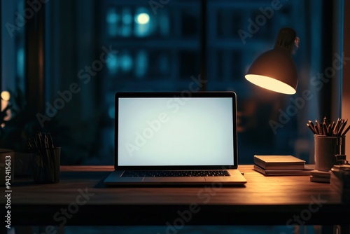 Office at night, dark work space, blank screen laptop mock up on wooden desk with light from table lamp with generative ai