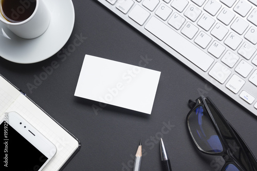 Office desk table with supplies. Flat lay Business workplace and objects. Top view. Copy space for text
