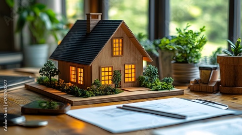 Office desk with house model, mockup tools, and design drafts for home construction,