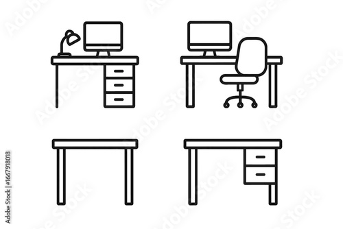 Office Desk Workspace Outline Icon Set. Modern Computer Desk, Table, Chair and Lamp Vector Collection. Minimalist Line Art Furniture Icons for Office and Home Workspace, Transparent Background
