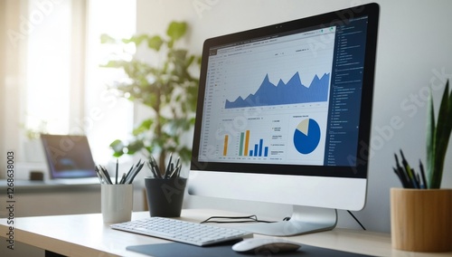 Office desktop displaying data charts, plants, sunlight