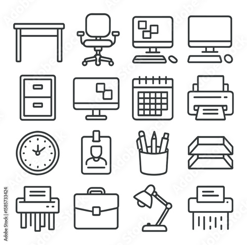 Office essentials icon collection. simple linear desk, chair, computer, file, calendar, printer vector icons.