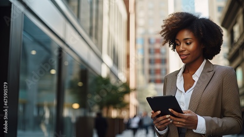 Office girl of African descent Or executives are standing and walking on the street using their phones to make transactions, for example. fintech in a business district with tall buildings
