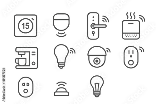 Office IoT Device Icons. Outline icon set of office IoT devices: smart thermostat, motion sensor, door lock,