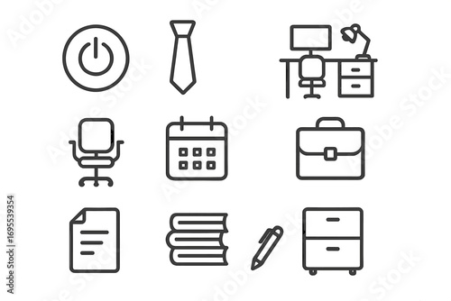Office line icon pack. Business equipment collection. Workspace, workplace concept. Vector icons of desk, computer, chair, calendar, briefcase, document, pen, books and tie.