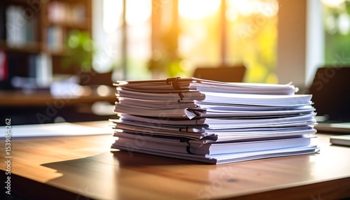 Office paperwork stack with sunlit desk.