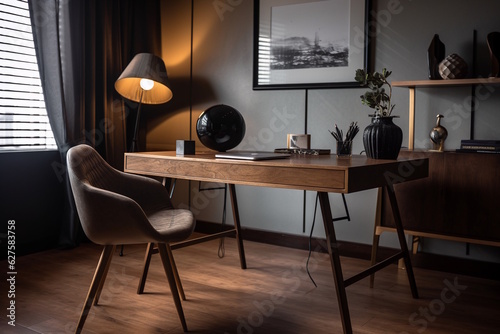 Office Room with Chair, Laptop, and Table: High-Quality Photogenic Cinematic Image for Professional Presentations and Website Designs. Generative AI