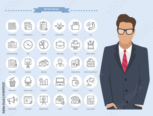 Office thin line icons. Businessman with set of office contact and payment icons, connection methods illustration. Serious bearded man wearing business clothes and outline web elements templates