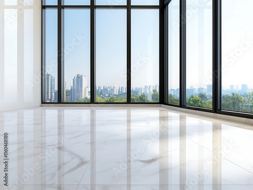 Office under construction with open atrium, glass balconies being installed, marble flooring in progress, urban cityscape in the background, midday light