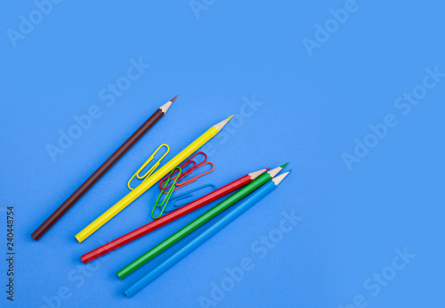 Office utensils supplies concepts, Colorful crayon pencils and multi-colored clips on blue background with copy space. View from above.