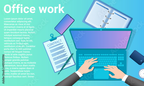 Office work.A businessman works at his desk and performs business tasks.Poster in business style.Flat vector illustration.