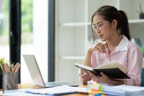 Office worker or businesswoman, attractive Asian woman in eyeglasses researching Analyze information about the business plan. take notes in a book Notebook while using a laptop computer at her desk.