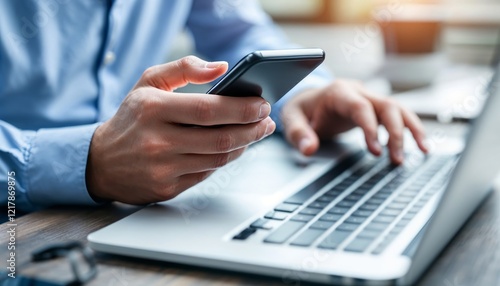 Office worker typing on a laptop while using a smartphone, symbolizing productivity and multitasking in a modern workplace with a professional focus.