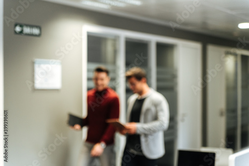 Office worker walking with colleague at office space