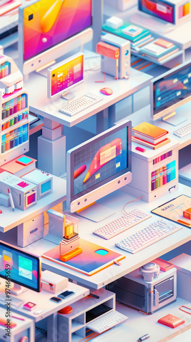 office workspace computer technology digital modern desk monitor keyboard mouse colorful design interior futuristic equipment screen creative business setup