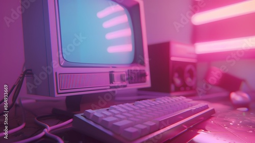 Office workstation setup with computer monitor, keyboard, mouse, and desktop equipment in vector design
