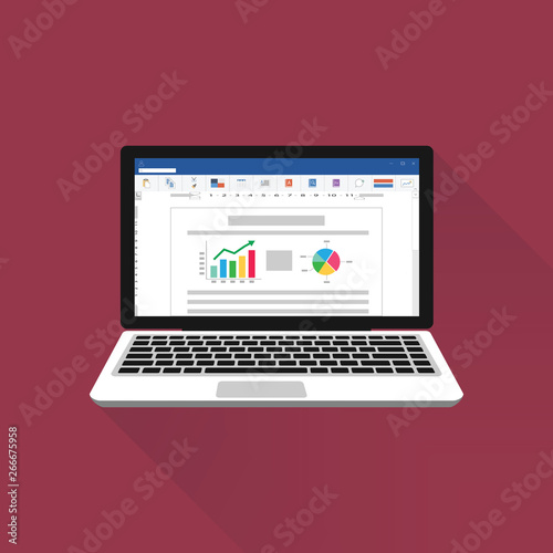 Official word software laptop screen with financial accounting data. document database analytical business report with chart and pie graph. audit investigation document. flat vector illustration