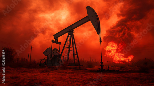 Oil Derrick and Fire: An imposing oil derrick stands silhouetted against a dramatic backdrop of a fiery red sky, a blazing fire indicating energy production or environmental concern.