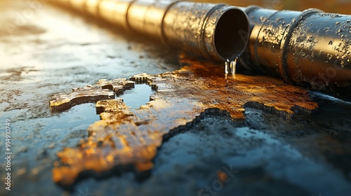 Oil industry concept showcasing an oil tube pipeline with spilled oil forming a map of Russia 3D illustration