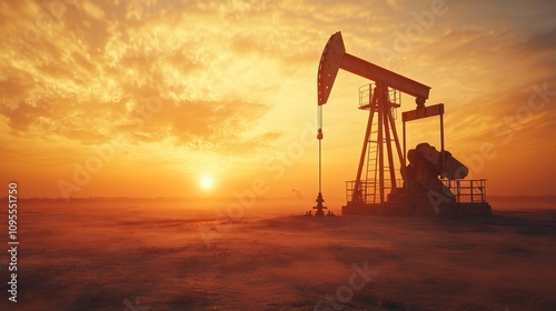 Oil pump jack in a remote oil field, moving arm, dusty environment, realistic weathering, sunset lighting