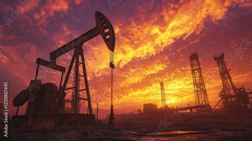 Oil Pump Jack Silhouetted Against Dramatic Sunset Sky with Surrounding Drilling Equipment