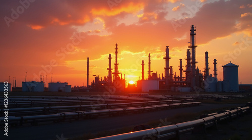 Oil Refinery at Sunset: Industrial Pipelines and Storage Tanks