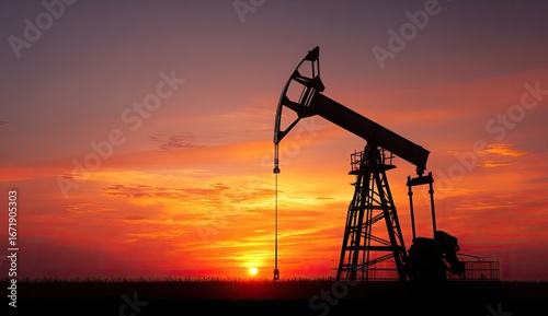 Oil rig at fiery sunset, industrial silhouette against a vibrant sky