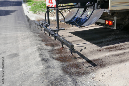 Oil spreader truck applying tack coats spraying bitumen emulsion with spray lance before applying a new layer of asphalt .