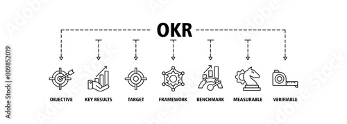 OKR banner web icon set vector illustration concept for objectives and key results with icon of objective, key results, target, framework, benchmark, measurable, and verifiable