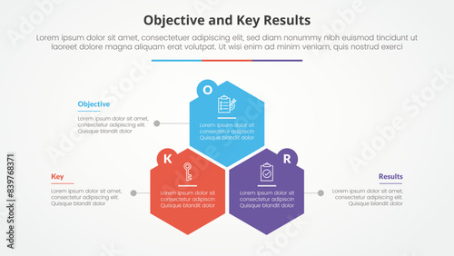 OKR objectives and key results framework infographic concept for slide presentation with hexagon or hexagonal shape structure with 3 point list with flat style