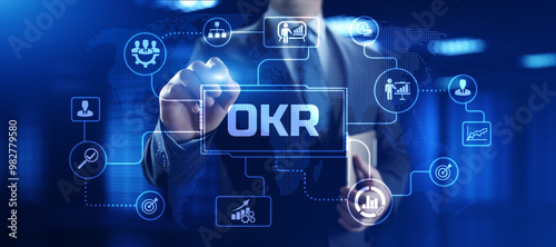 OKR Objectives key results. Businessman pressing button on screen.