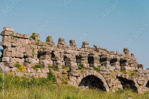 Old aqueduct in Side. Ruins of the ancient city of Turkey. Antalya coast.Antalya Province. Pamphylia. Ancient building. Historical place