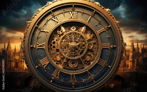 Old astronomical clock at black background.