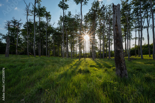 old beech forest in slovak little carpathian mountains with dead trunk of standing beech and setting sun