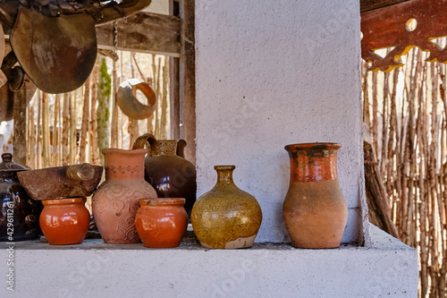 Old Caucasian pottery on a whitewashed oven in the yard.