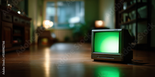 Old CRT monitor glowing green light on wooden floor in dim room with blurred background and warm lighting