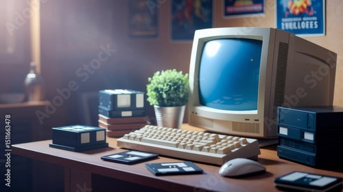 Old fashioned computer. Retrofuturism, history of technology, cyberpunk and digital culture of the 80s-90s