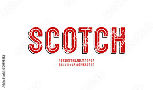 Old font, retro alphabet, frayed letters and numbers