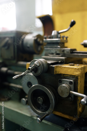 Old locksmith lathe, components and tools. Lathe close-up, metal with a blurred background.