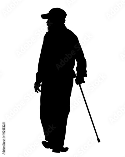 Old man on crutches is walking down the street. Isolated silhouettes on white background