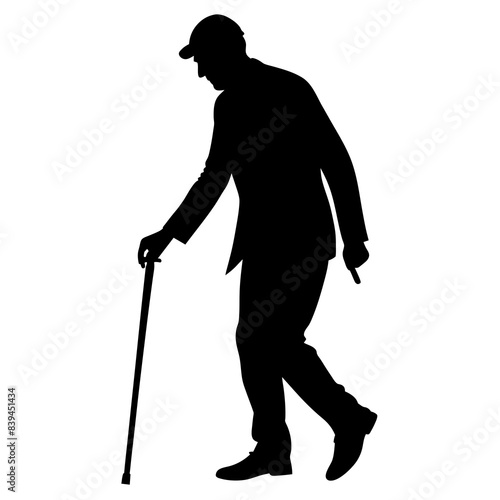 Old man walking and leaning on a cane, on a white background