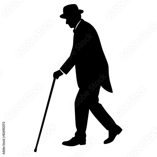 old man walking and relying on a cane, black color vector silhouette set against a white background