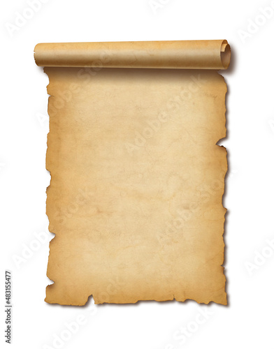 Old mediaeval paper sheet. Parchment scroll isolated on white with shadow