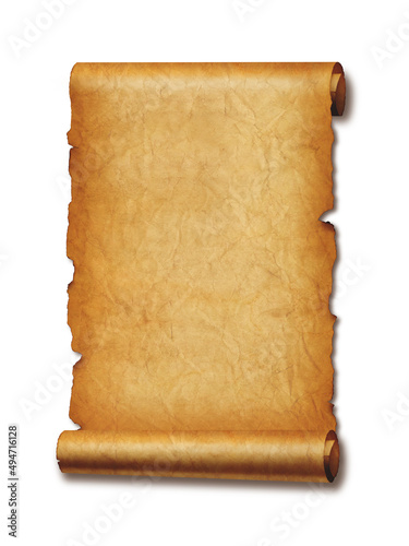Old mediaeval paper sheet. Parchment scroll isolated on white with shadow
