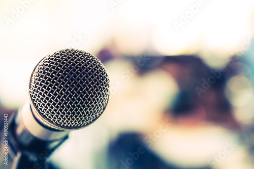 old microphone in front of seminar room, copy space on right, blue tone, education, experience and training concept