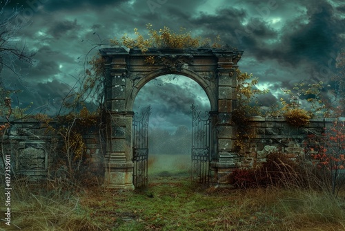 Old, ornate gate stands open under a dramatic, stormy sky, evoking a mood of mystery and fantasy